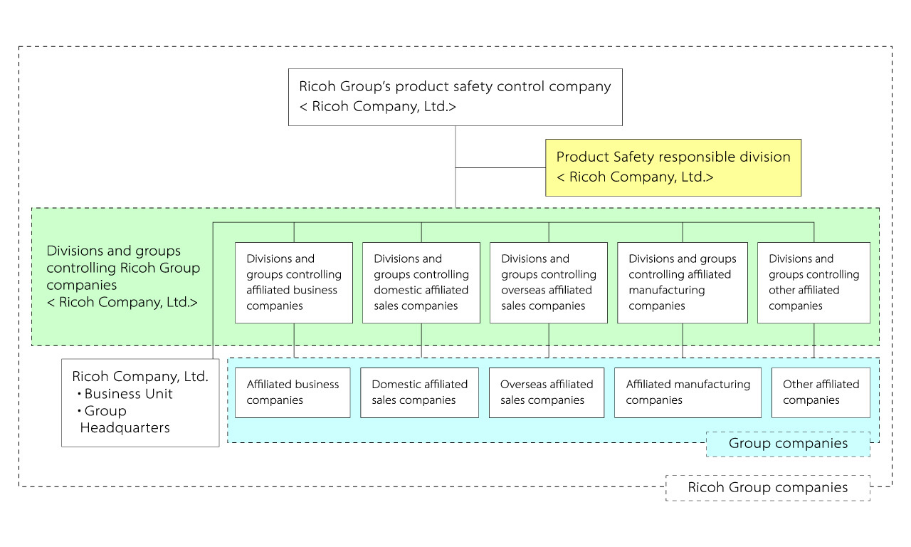The principal Ricoh Group company involved in product safety activities is Ricoh Corporation, which has established Product Safety responsible division. Furthermore, it has set up related company head management departments responsible for the management and operation of each group company, ensuring the safety system of products across the entire Ricoh Group. Additionally, each company within the Ricoh Group sets evaluation steps necessary for product safety activities and manages quality assurance activities through further improvements.