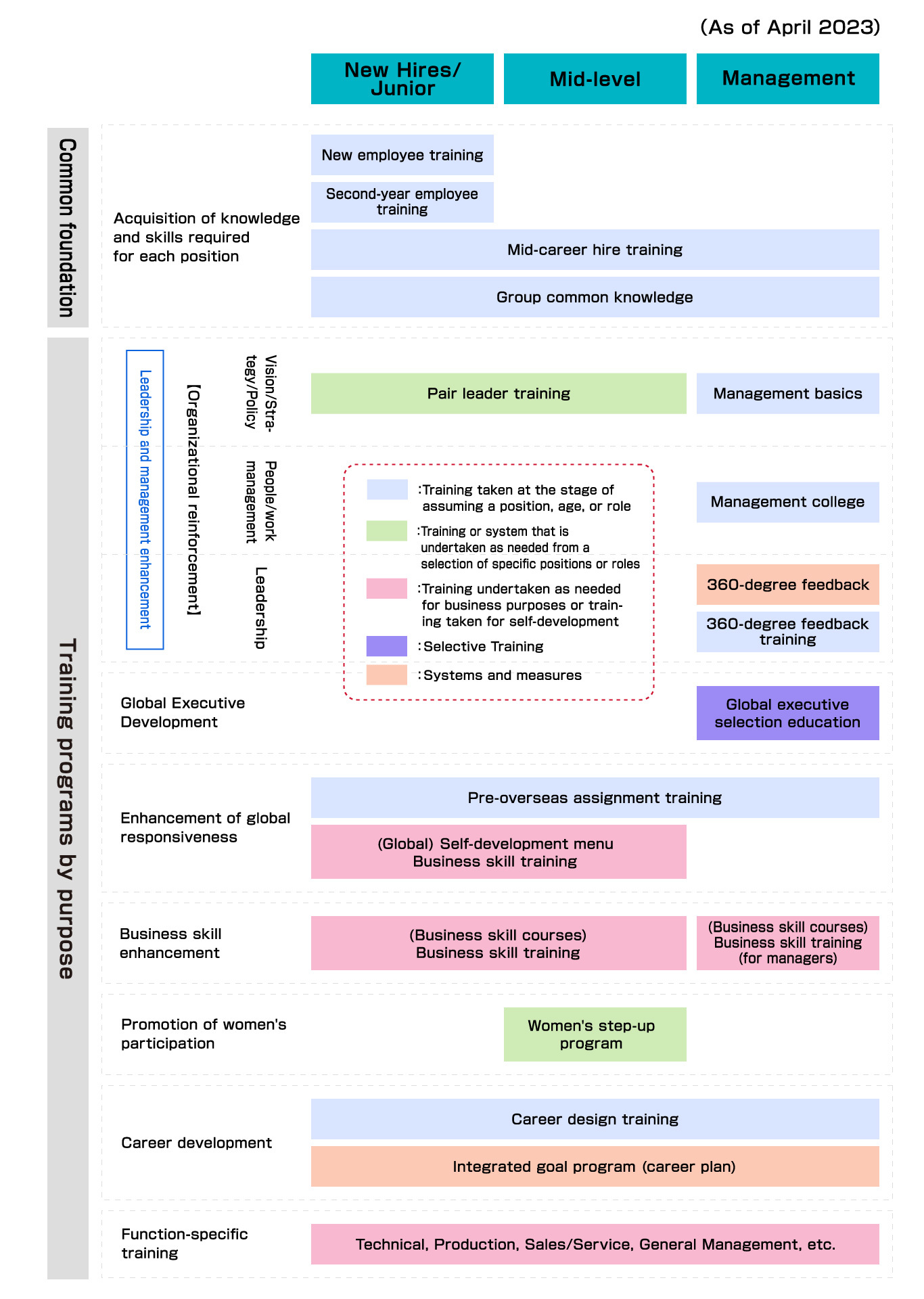 The Ricoh Group has established a human resource development system based on the following two points to promote autonomous learning in the workplace and to develop human resources in line with management strategies. The system consists of "training by job title" and "training by purpose", so that employees can take the training programs necessary for their positions and job categories (Refer to the training system diagram below).