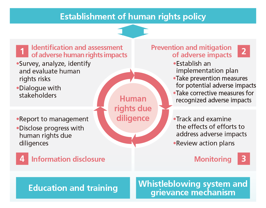 Under the responsibility of management, we will continue to work on 1. Identification and assessment of adverse human rights impacts, 2. Prevention and mitigation of adverse impacts, 3. Tracking, and 4. Information disclosure through business activities and supply chains.