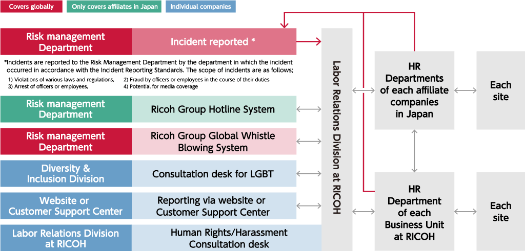The Ricoh Group provides multiple whistleblowing systems and grievance mechanisms that allows stakeholders of the Ricoh Group to report their concerns about human rights without fear of retaliation.