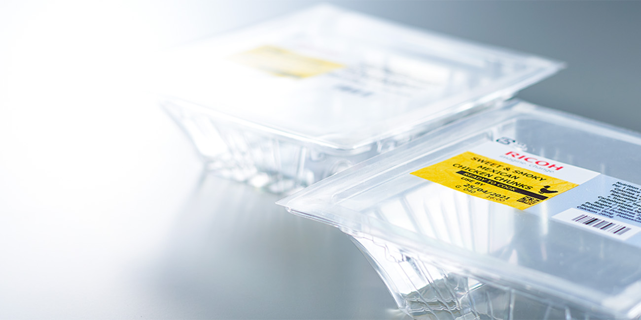 We have developed a technology that enables direct printing on transparent film, resulting in label-less packaging. This technology helps reduce the carbon footprint by decreasing the need for labels and ribbons, reduces dead stock by standardizing packaging materials that vary by product, and increases productivity by eliminating the need to prepare and replace labels and ribbons.