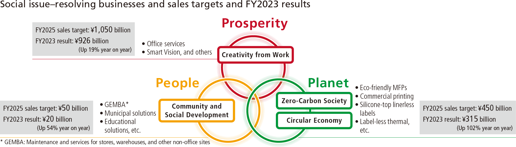 | Community and Social Development | GEMBA (Maintenance and services business targeting other than offices) Municipal solutions Educational solutions, and others |