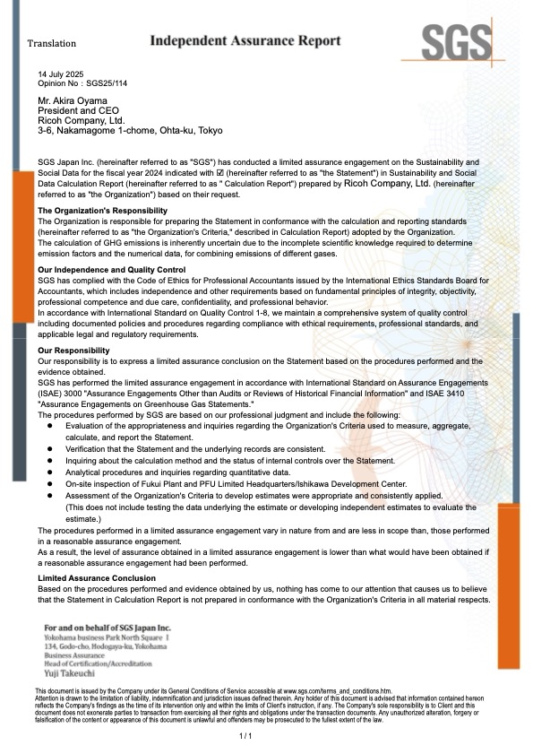 The Ricoh Group's major environmental performance data, including greenhouse gas emissions (Scope 1, 2 and 3), major social data are subject to independent verification by SGS Japan Inc. a third-party audit provider, as a way of enhancing the credibility of the data and our compliance system. Audit results are posted on our website for easy access by our stakeholders.