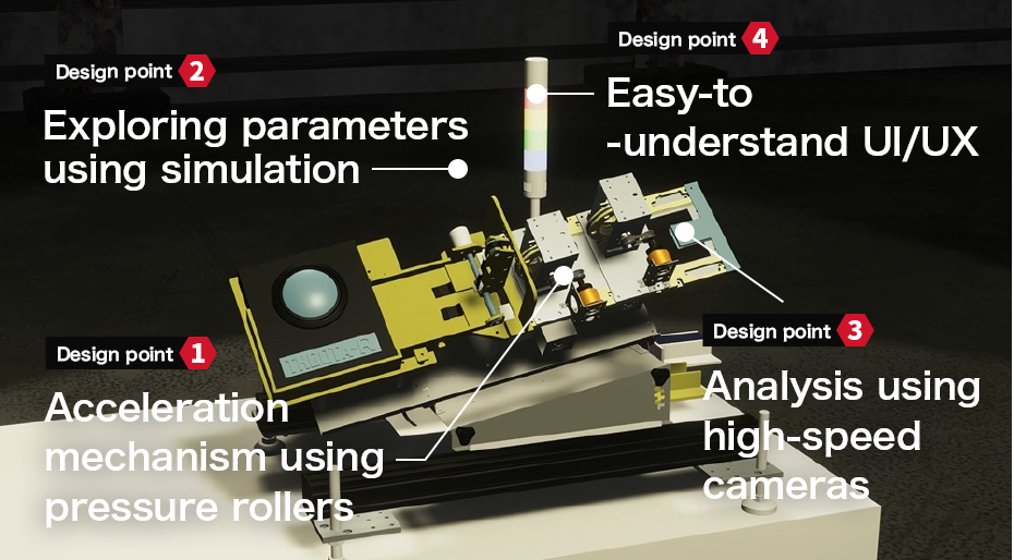A microcomputer with a monitor was used to adjust the roller speed easily. The easy-to-understand UI design also prevented operational errors during the actual demonstration. A signal light tower was attached to the device to improve safety and easily see from a distance when a disk would be ejected. The signal tower used was the same as those on commercial printers.