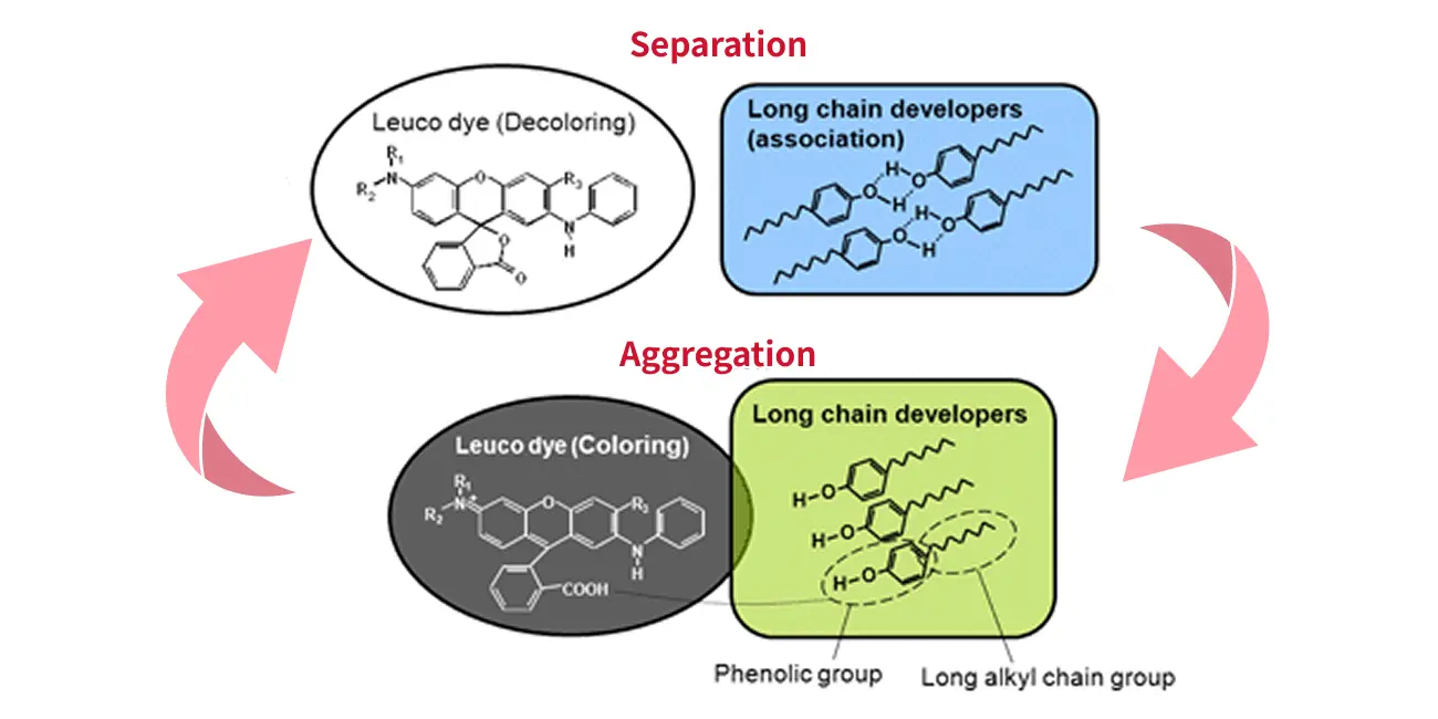 Fig. 1: Coloring and decoloring control by aggregation and separarion of leuco dye and long-chain type developer