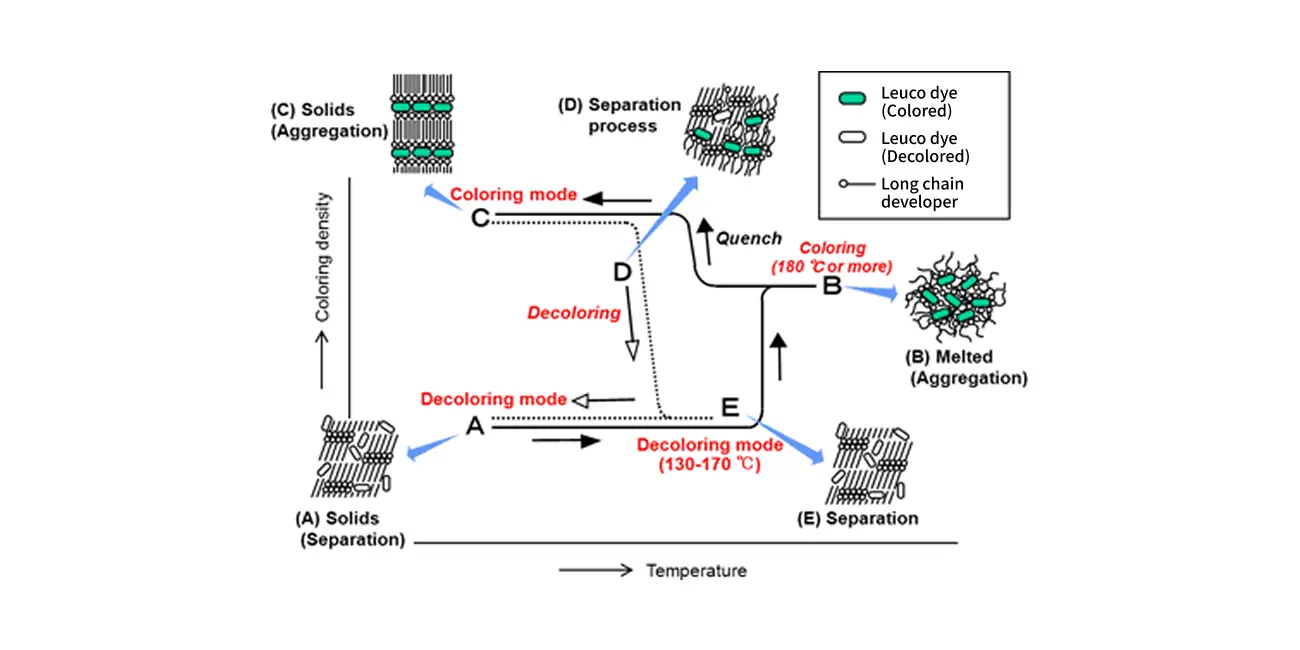 The typical coloring and decoloring process of leuco dye/long-chain developer type thermal rewritable recording material and the mechanism of coloring/decoloring phenomenon are shown in Fig. 2. When a developer is heated from a decoloring mode (A) beyond the melting point, it melts and reacts with the leuco dye; color develops (B). When is quenched from here, the developer clumps together with regularity while maintaining a bond with the leuco dye and a coloring mode is fixed (C). When the temperature rises from coloring mode (C), this condensed state begins to collapse at a temperature lower than coloring temperature (D). When the temperature rises further, the developer associates (the phenomenon of two same kind molecules joining together and acting as one molecule), builds a crystal independently, and sputters out leuco dye to decolor (E). When cooled from this state, it returns to the original decolored state (A). The developer stays in the crystallized state at (A), which is the most stable state.