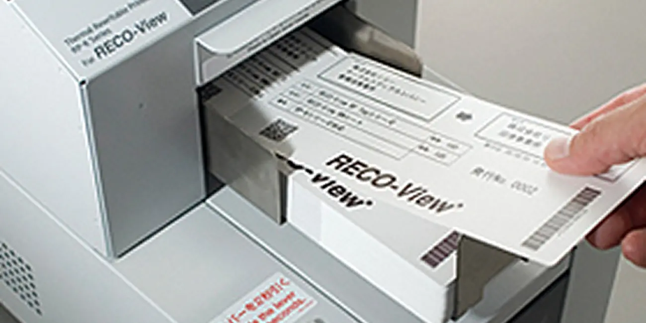 Ricoh's rewritable recording technology was first put into practical use for card displays, such as point cards, commuter passes, etc., where the display needs to be rewritten. RECO-View RF tags were then commercialized, combined with RF-ID used for production control etc., further expanding the application to a rewritable laser system where the media for a physical distribution application affixed on returnable containers can be rewritten with no contact.