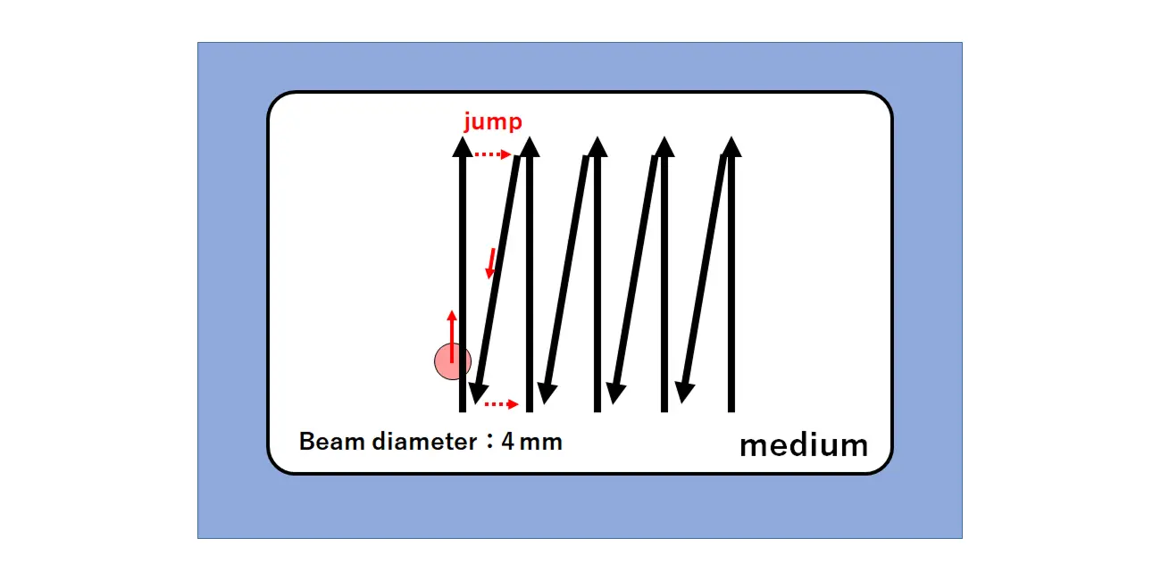 The rewritable laser system erases images by irradiating the circular beam two-dimensionally, as shown in Figure 4. We shorten the erasing time and prevent the folded part from overheating by running N-shaped reciprocating scans continuously. Figure 5 shows how it is erased. Since the irradiation laser is invisible light, it is not possible to visually confirm the trajectory of the light.