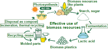 Biomass plastics utilize the biomass resources of regenerable biological origin. Currently, biomass plastics based on plant-derived materials are in practical use. The plastics are high-polymer materials made of raw materials consisting of starch, sugar, or cellulose contained in plants. One example is polylactic acid, the chemically-synthesized lactic acid that is fermented from starch. Even if polylactic acid is incinerated, the CO2 emitted is absorbed by the plants used as raw materials through photosynthesis during their growth. Therefore, it does not increase the CO2 in the atmosphere (carbon neutral). It is an environmentally-friendly material that does not contribute to global warming (Figure 1).