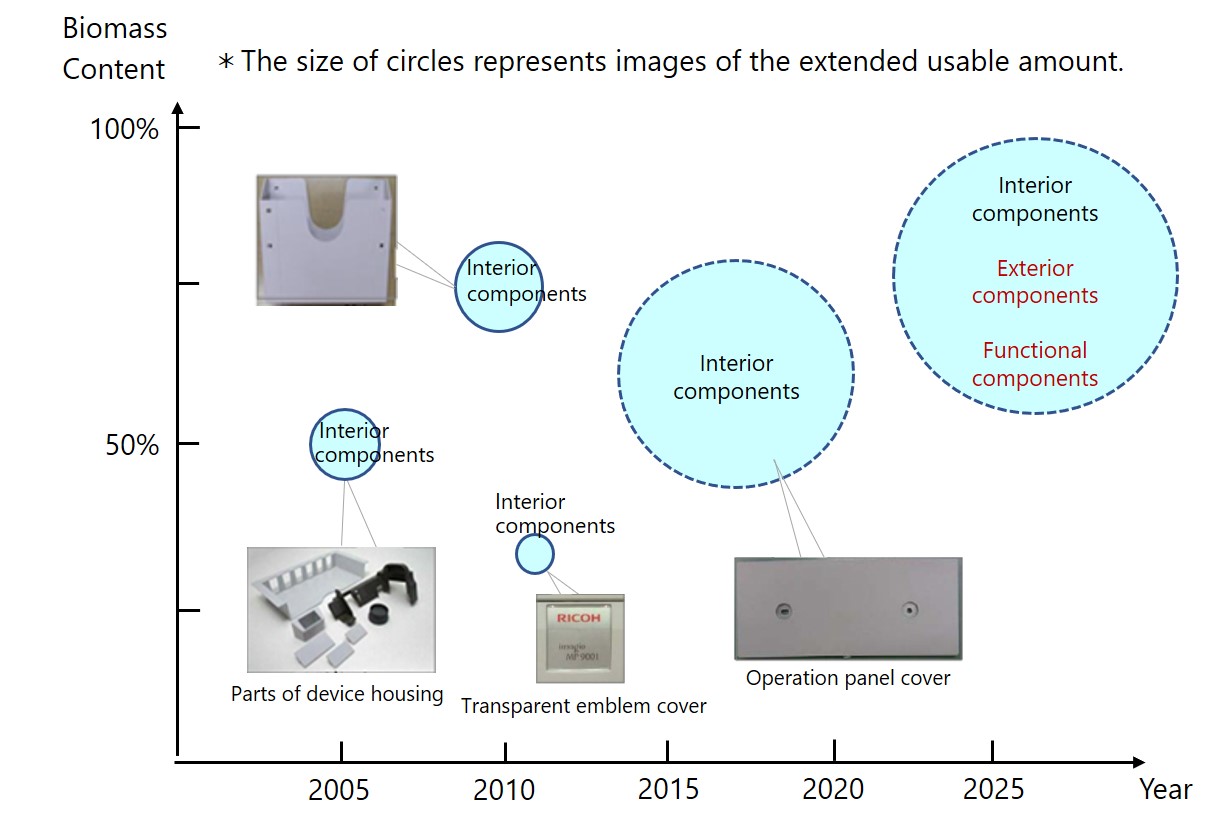 Ricoh is currently developing new biomass plastics with higher biomass content, heat resistance, and impact resistance without mixing petroleum-based plastics.