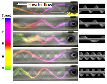Figure 2: Structures of flows of developer powder transported by screws of various types visualized with X-ray