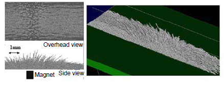Figure 4 shows three-dimensional behavior of the developer powder, namely, the magnetic brush phenomenon, calculated by DEM with the system.