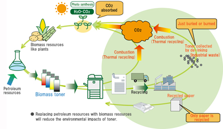 The biomass toner requires less petroleum than conventional toner, and contributes to the prevention of petroleum depletion. Being carbon-neutral, the biomass toner works to reduce the net amount of CO2 emitted from the combustion of used toner.