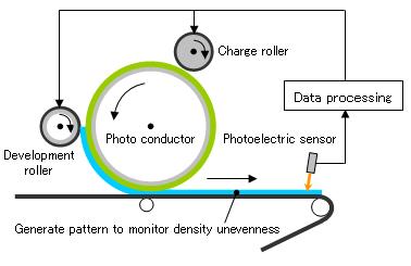 Generally, image density unevenness is generated by variations in the amount of adherent toner, and the variation originates in the dimensions and operating environments of parts related with image formation, such as the photo conductor and development roller. With Ricoh’s image density uniformity improving technology, an image pattern is created on an image transfer belt inside the printer. The pattern is read by a photoelectric sensor and the density unevenness is detected from the image data read. And depending on the detected density unevenness pattern, the voltages applied to the development roller and charge roller are controlled so that density unevenness can be reduced (Fig. 1).