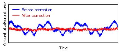 As a result, the amount of adherent toner becomes uniform, thereby improving the uniformity of image density of prints (Fig. 2). Because a series of image compensation operation is automatically done inside the Multifunction Printer, trial printing for compensation is not needed.