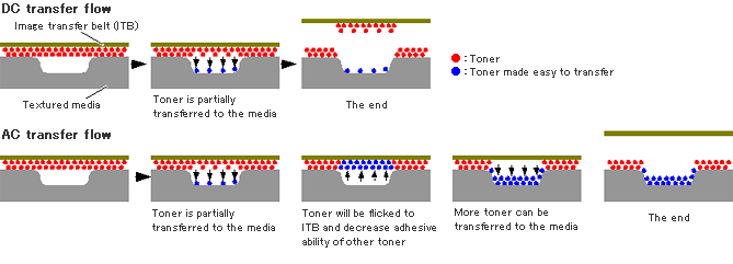 Generally electro-photographic printing uses a direct-current electric field (DC) to transfer toner from an image transfer belt onto paper. With textured media, which has convex-concaves on the surface, because the paper hollows between the concave part and the image transfer belt, toner is hard to transfer, and the image partially falls out. Ricoh developed a new technology to use an alternating-current electric field (AC), which produces a condition that enables toner to transfer easily to the concave portion of the paper.