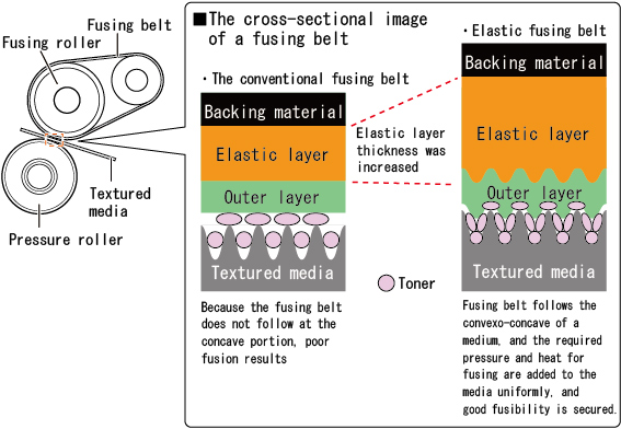 The toner transferred to the concave portion of textured media had a problem with improper fusing because the fusing belt could not respond to the concave portion. To overcome this problem, we thickened the elastic layer of the fusing belt and enabled the fusing belt to respond to the convexo-concaves of textured media (Fig. 2). This produced the required pressure and heat for fusing to be added to the paper (toner), and enabled good fusibility also on textured media. To prevent worsening of the thermo following property, especially in thickening the elastic layer, we used IH technology, which is excellent in thermal-response properties.