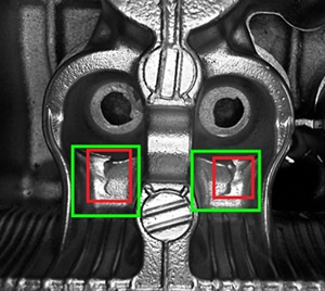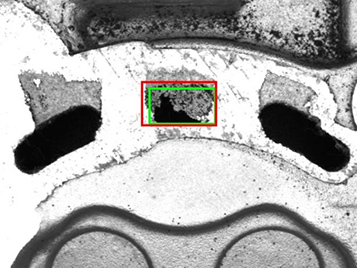 Figures 1 and 2 show examples of detection results using the algorithm. The red frames indicate the correct-answer areas designated manually, where defects are to be detected. The green frames indicate the areas where defects are detected according to the algorithm. The figures show that the detection areas obtained by the algorithm are similar to the correct-answer defect detection areas.