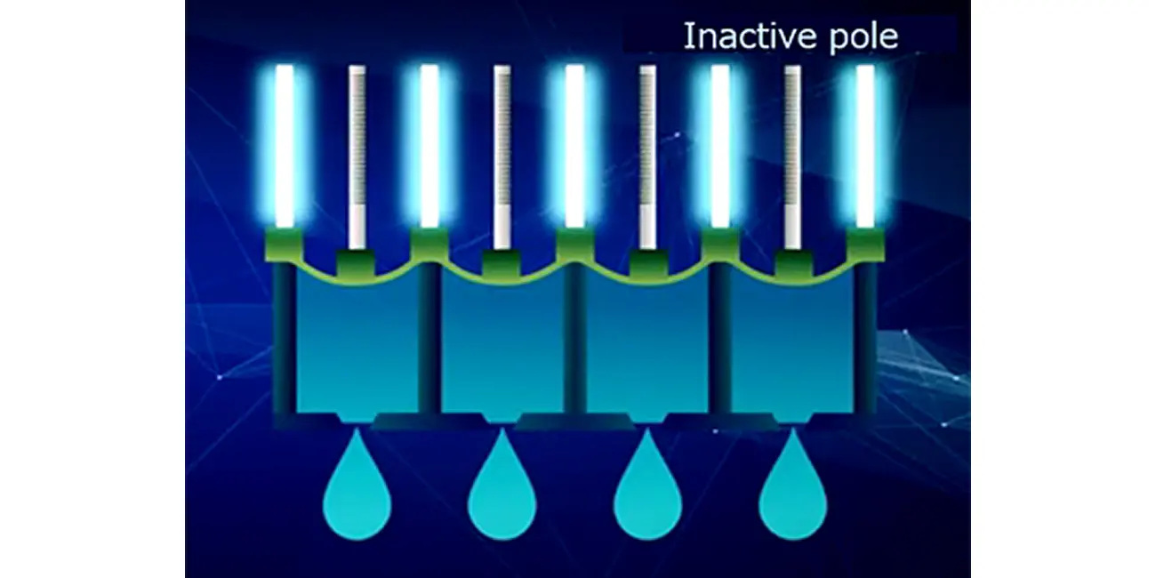 The supports for individual ink tanks are weak with the conventional push-mode piezo device. When a piezo actuator pushes the tank, it influences and warps the adjacent tanks. Consequently, the amounts of ink discharges vary in the center and ends of the head. To solve this problem, Ricoh uses active and inactive piezo poles. An active pole, which produces pressure fluctuations in an individual tank, is supported by inactive poles at both ends. This construction prevents mutual interference between the adjacent tanks. The inactive poles located between the individual tanks enable stable, accurate control of ink discharges from the tanks. Further, the active and inactive piezo poles are alternately positioned at a density double the nozzle pitch. Push-mode piezo devices are generally rigid, but Ricoh's construction is even stronger and boasts high durability. The stable, accurate control of ink discharges has enabled high-speed printing while using optimal drop sizes for different images (multi-drop control technology). The speed and quality of printing have been greatly enhanced.
