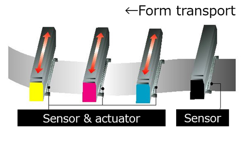With reference to the K position, the sensors detect the form position misalignment during the CMY printing step. The detected misalignment is used to calculate the amount of form meandering. The actuators control the head positions according to the long-cycle form meandering.