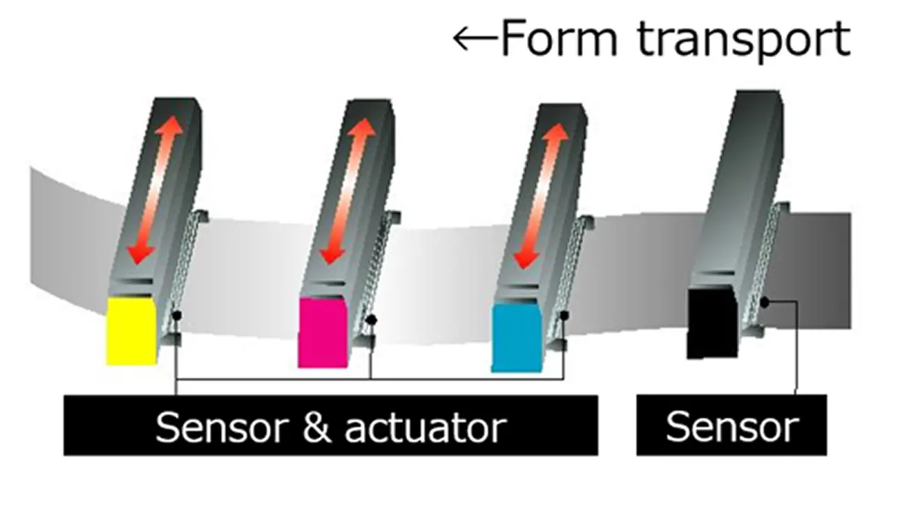 Dynamic print head positioning, a proprietary technology of Ricoh, compensates for form meandering and misalignment beyond the capability of a form controller. The technology features an automatic print head position adjustment unit, which increases the print position accuracy by detecting small form movements and moving the print head accordingly. It will be useful in preventing plate misalignment and improving front/back side registration quality.*2