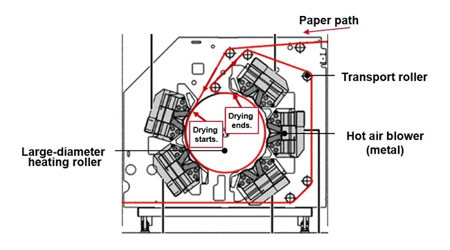 The new drying system has no hot air blowers. Instead, three components are installed: small-diameter heating rollers, transport rollers to ensure the paper tightly adheres to the small-diameter heating rollers, and resin blowers that pass room-temperature air over the ink (Figure 4).