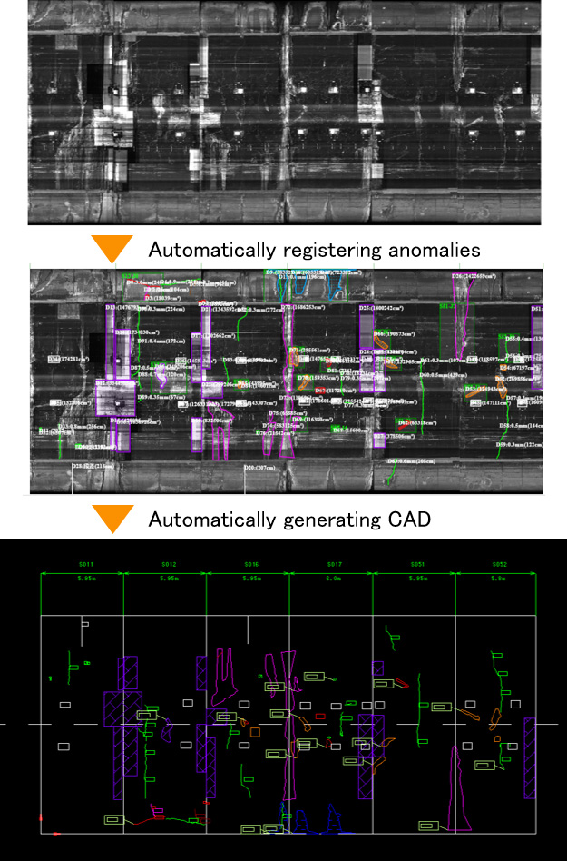The photographed images are processed according to the shape of the lined surface. Precision expansion images are automatically generated. The expansion images make it possible to check the surfaces for cracks and loose bolts (counter marks). In addition, cracks can be automatically detected by the automatic crack detection function, which uses AI (Artificial Intelligence).