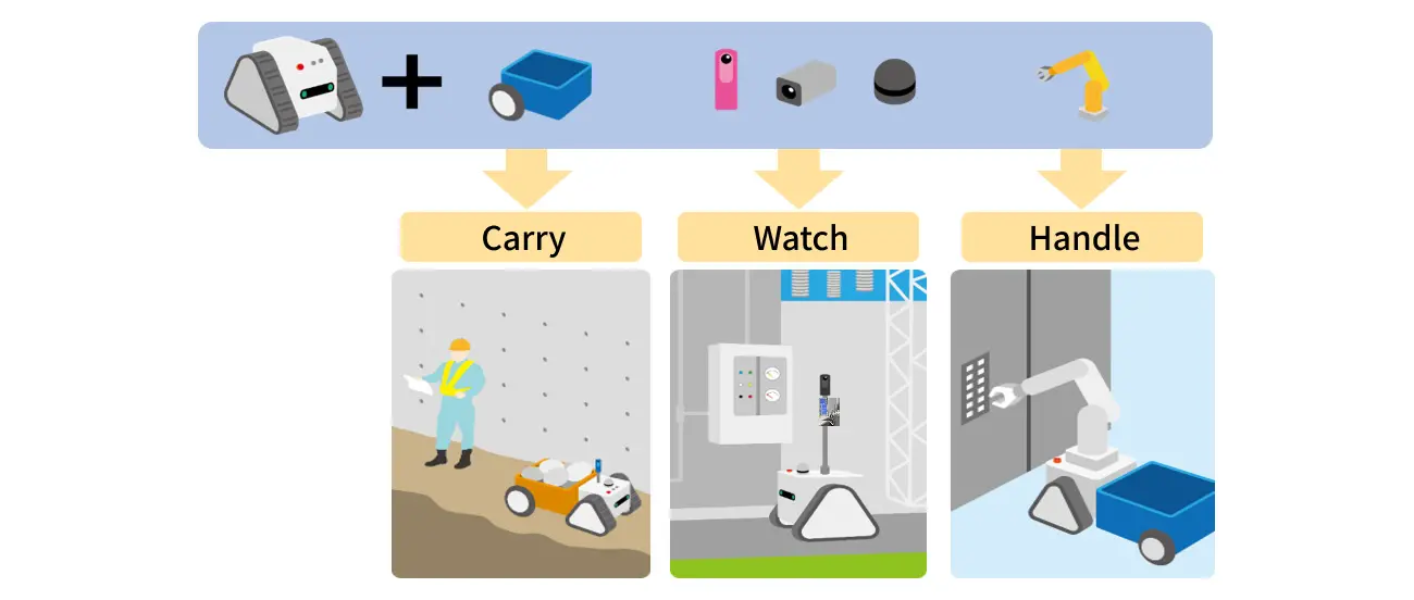 With the crawler unit used as the underside, by changing the combination modules on the upper part of the crawler unit according to the application, the robot can replace the human's “carrying,” “watching,” and “handling.” For example, the robot can replace human workers in various situations such as transporting and towing materials at construction sites, inspecting facilities at substations and chemical plants, patrolling around commercial facilities, and even harvesting crops.