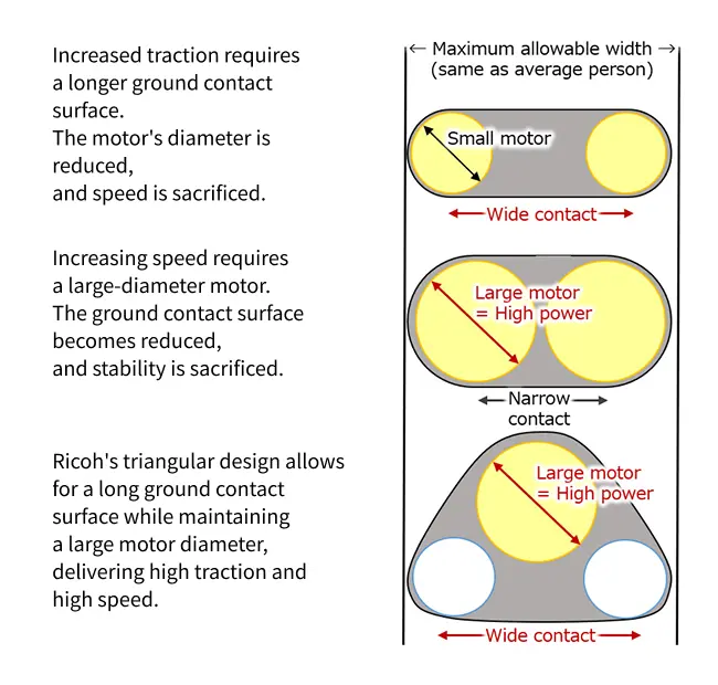The answer is the triangular design where the in-wheel motor is installed at the top. This triangular crawler shape successfully balances size, speed, and traction performance at a high level. (The design has been patented.)