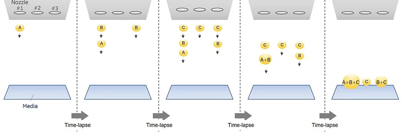 With multi-drop control technology, ink droplets are discharged at high speeds from the printhead nozzles and instantaneously merged before reaching the media surface. This technology controls the sizes of the droplets, so both small and large droplets can be discharged from a single inkjet printhead.