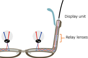Ricoh has developed a special optical system that uses relay lenses and places the display unit near the temples. The display image on the display unit is reproduced on the light guide plate by passing through relay lenses. By shrinking the display unit and placing it near the temples, and using thin lenses, the weight balance between the front and rear of the smart glasses is almost the same, and the load on the nose is reduced to the same level as general eyewear. With this technology, users can wear the smart glasses comfortably for a long time.