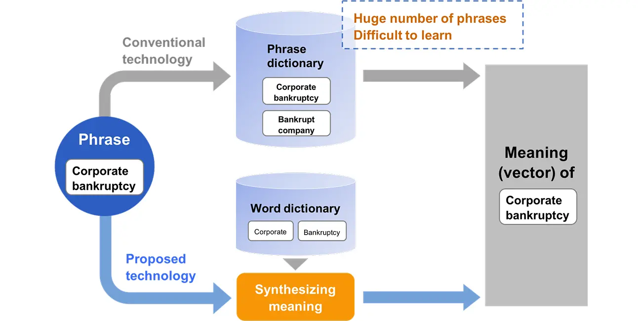 Deep Alignment uses phrases, which consist of multiple words, as keys for association. It synthesizes the meaning of words obtained through deep learning into the meaning of phrases, thus enabling precise association of meaning.