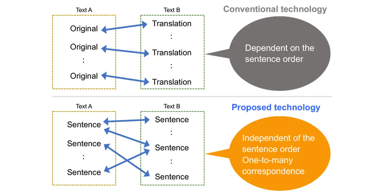 In the area of machine translation, technologies have been developed to associate original and translated sentences in two texts. Conventional technologies have only limited applications, as they assume a correlation between both texts in terms of their sentence order.