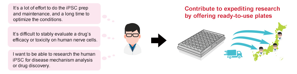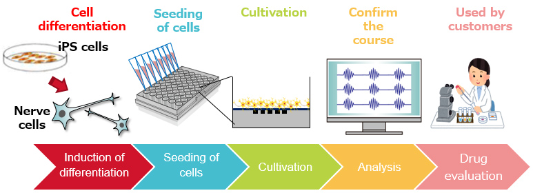In the development of new drugs, animal models are generally used to confirm the drug's effcacy and toxicity. However, since human cells differ from other animals, toxicity against humans may become evident in the clinical trial stage. To solve the problems of neural systems that are greatly affected by the specific differences between humans and animals, the development of evaluation systems using human iPS cells is being carried out. A representative technique is Multi-Electrode Array (MEA). In MEA assay, iPS cell-derived nerve cells are seeded and cultured on multiple electrodes indwelled on the bottom of each well. Production of nerve cell plate by the users themselves involves tremendous labor, cost, and risks, including cell culture know-how, a prolonged culture period, and problems such as agglutination and stripping off cells. Nerve cell plates are being sought that require no cultivation and can be used quickly.