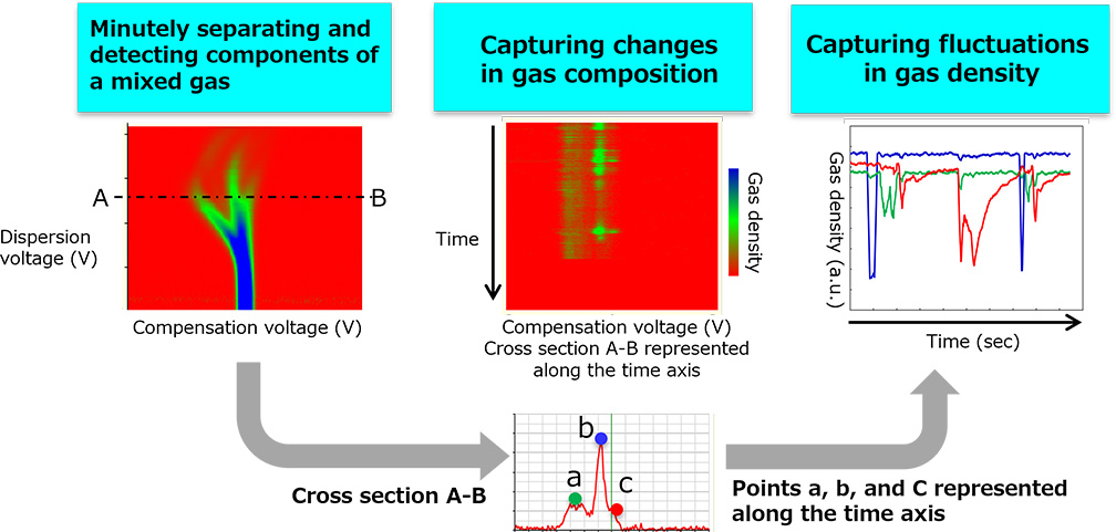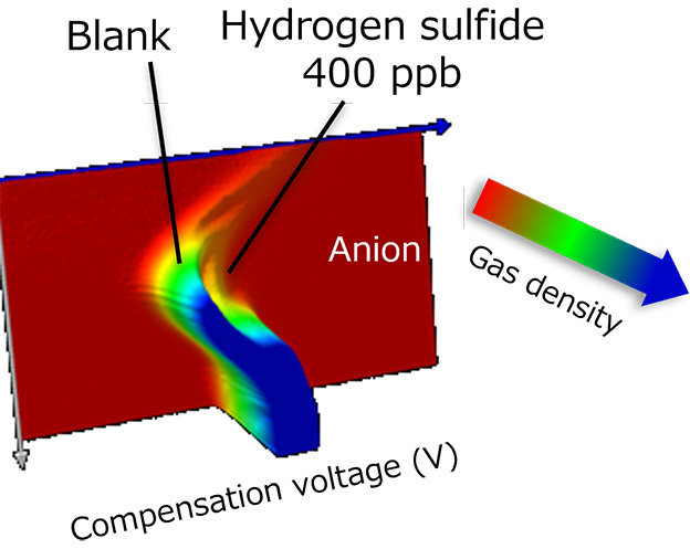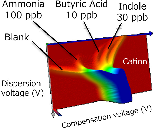 Ricoh has adopted FAIMS (Field Asymmetric Ion Mobility Spectrometry), a technology that classifies ionized gas and odor molecules in a special AC electric field into different types, and detects them as electric current. FAIMS was originally a technology for chemical analysis intended for use in a special environment; Ricoh re-developed the core part of FAIMS to make it usable in a generic environment. Ricoh's FAIMS system takes a sample of a compound gas using a pump and seamlessly measures it in real time to capture the changes in gas composition. The prototype is battery-driven and portable, measuring 220 mm wide, 120 mm high, and 160 mm deep.