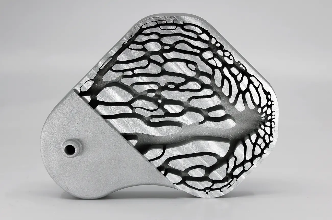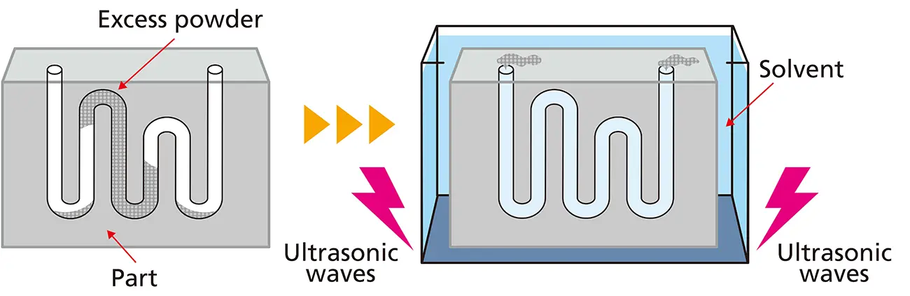 High-performance heat exchange components may require complex flow channels, but completely removing the powder remaining in the channels after printing can be difficult. Ricoh has developed a powder removal technology using solvent that can reliably remove powder even from very narrow channels.