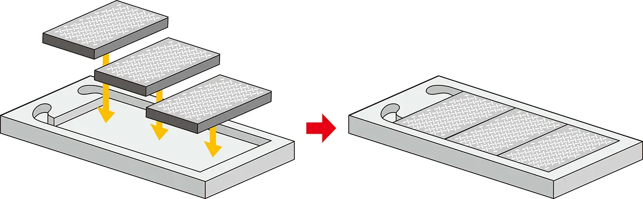 Heat exchange components may be required to be over 300 mm in size, depending on the application, but there are restrictions on the size when making them by a sintering process. Ricoh has developed a technology to form the intricate flow channel part using the BJT process and join it with an outer case manufactured by conventional methods. This makes it possible to manufacture large parts at low cost.