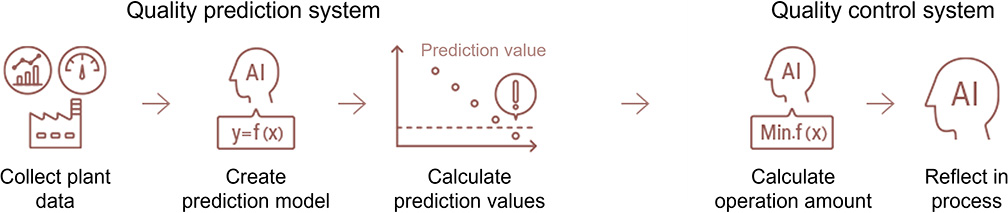 In Ricoh's chemical toner manufacturing process, skilled engineers perform quality control manually based on their know-how. This requires many person-hours for process monitoring and operation amount instructions and places a high mental burden on the employees because control errors could lead to significant losses. By introducing an automatic toner quality control system*1 that utilizes machine learning, we have created a process that does not rely on the know-how of skilled engineers, thereby improving productivity.