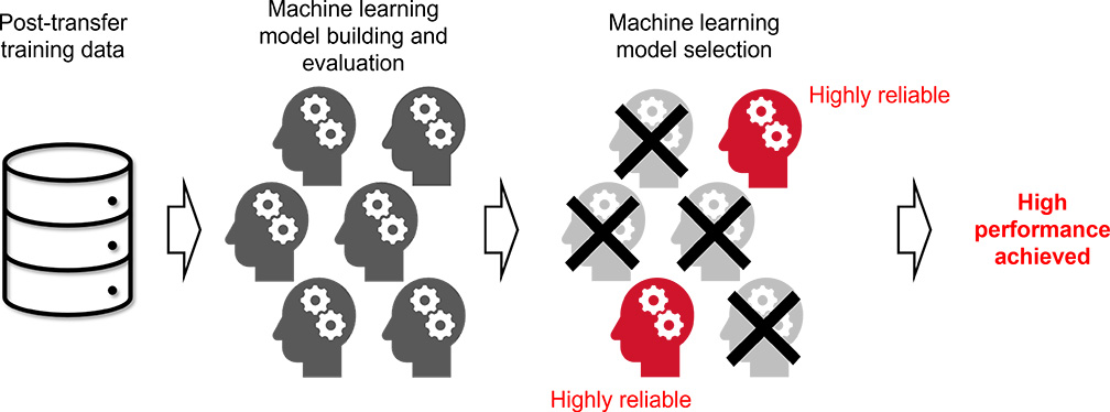 However, in the manufacturing process, improvements are often made to production equipment and raw materials to reduce the environmental impact and improve quality. Each time such improvements are made, a new machine learning model must be constructed, but this requires long-term data re-accumulation, and during this period, we have to rely on manual quality control. Therefore, technology for building high-performance machine learning models using short-term data was required.