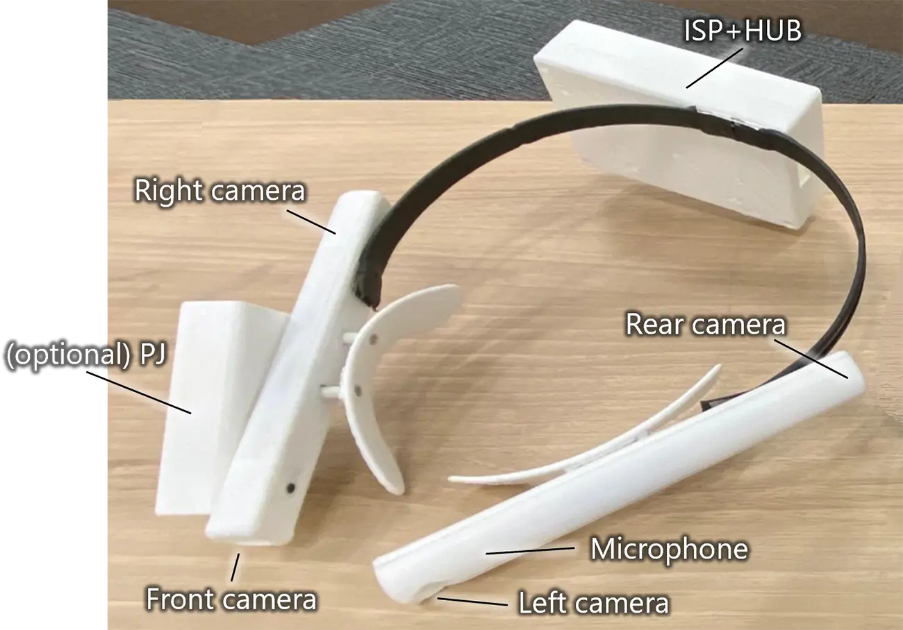 Ricoh has developed the world's first fully egocentric*1 360-degree wearable camera (as of June 2025, based on Ricoh research). Although there are currently some 360-degree cameras available that are worn around the neck or on helmets, this is the world's first 360-degree wearable camera that is worn close to the wearer's eyes. It allows for 360-degree recognition of surroundings. Equipped with a microphone and speaker, it also allows for voice interaction with LLMs*2. The proprietary AI can also warn of approaching objects in the vicinity and detect objects based on arbitrary text. For example, the wearer could ask for “people wearing helmets.”
