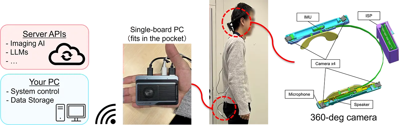 As shown in Figure 4, the device is controlled by a small single-board PC, making the entire system portable. The device can also communicate in real time with a server, allowing it to connect to LLMs and other state-of-the-art AI models and interact with them in real time via voice.