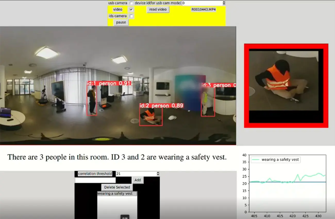 We have developed a real-time open-vocabulary object detection method for 360-degree video. The user can specify what to detect by freely entering text on the PC, and this exciting function holds great promise in a variety of fields. For example, it could be used to manage safety in a factory, such as entering text to detect “people wearing safety vests.”