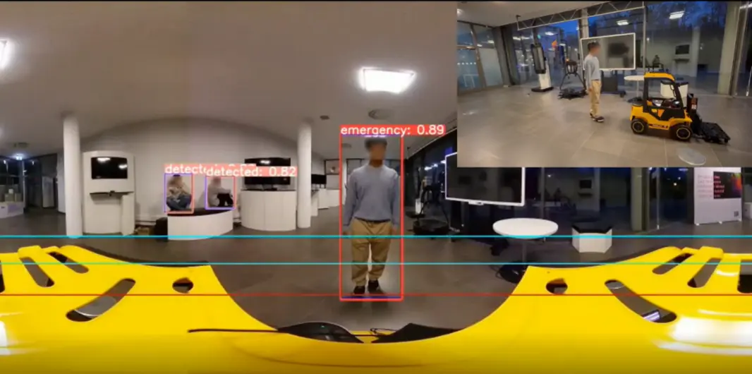 We have developed an AI that detects approaching humans in a 360-degree video. “RICOH THETA,” a 360-degree camera, is installed on a forklift and notifies the driver of people approaching the forklift to help prevent unexpected accidents such as colliding with people in the driver's blind spots.