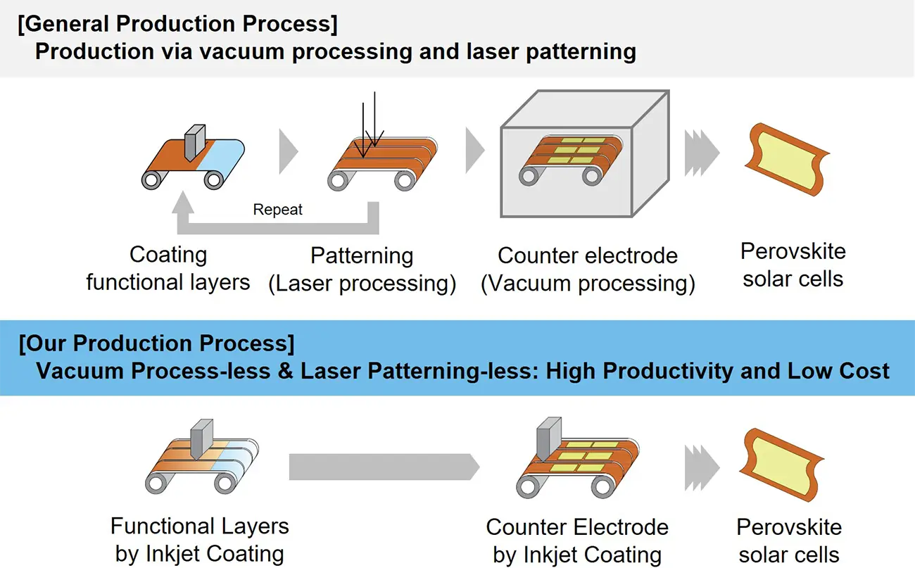 In a typical production process, the electron transport, perovskite, and hole transport layers are coated by spin-coating or die-coating, with the unnecessary coating film removed through laser processing for each layer. In addition, vacuum deposition is used to deposit the counter electrode.